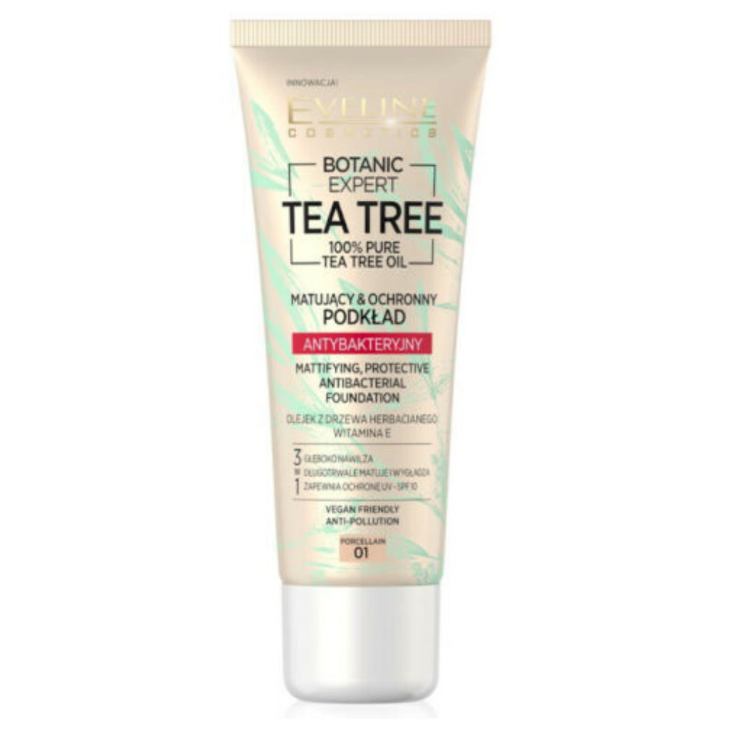 Eveline Botanic Expert Tea Tree Foundation Antibacterial Mattifying 02 Ivory 30ml delivers a flawless complexion while combating bacteria for clear, healthy skin. This foundation is specially formulated with tea tree oil known for its antibacterial properties, making it ideal for oily and acne-prone skin types. The lightweight formula provides a natural matte finish that lasts all day, perfect for those looking for long-lasting coverage without clogging pores.