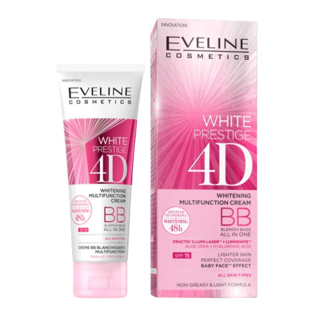 Experience skin perfection with Eveline White Prestige 4D BB Cream Multifunctional Whitening SPF15 50ml. This innovative BB cream combines the benefits of a moisturizer, foundation, and sunscreen in one powerful formula. Achieve a flawless complexion while providing your skin with essential hydration and protection from harmful UV rays.